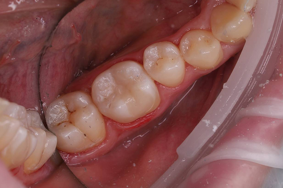 - Под местной анестезией после качественной изоляции было проведено вычищение патологической ткани с дальнейшей постановкой анатомической светоотверждаемой пломбы